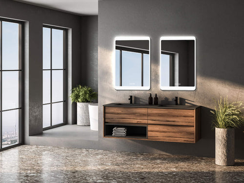 • Dunkle Töne + hinterleuchteter Spiegel nach Maß + dunkler Waschtisch → Anspruchsvoller, hotelinspirierter Luxus.