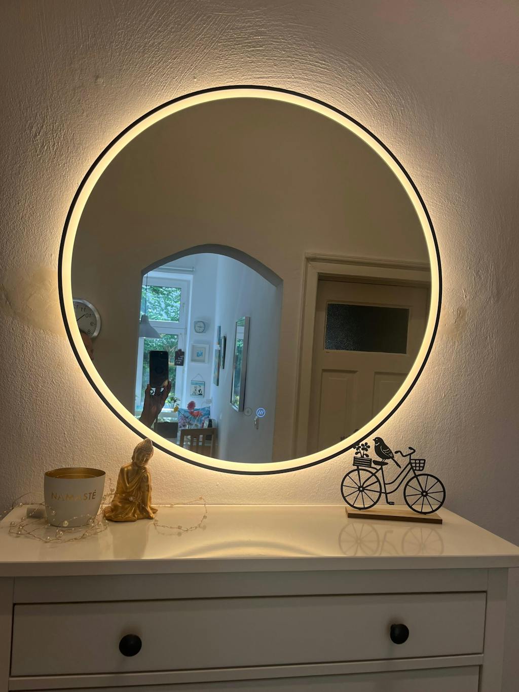 Der Spiegel sieht elegant und wertig aus. Der Lichtwechsel funktioniert problemlos und macht ein schönes Licht. Der Support war jederzeit zur Stelle. Wirklich schöner Spiegel mit passendem Rahmen!