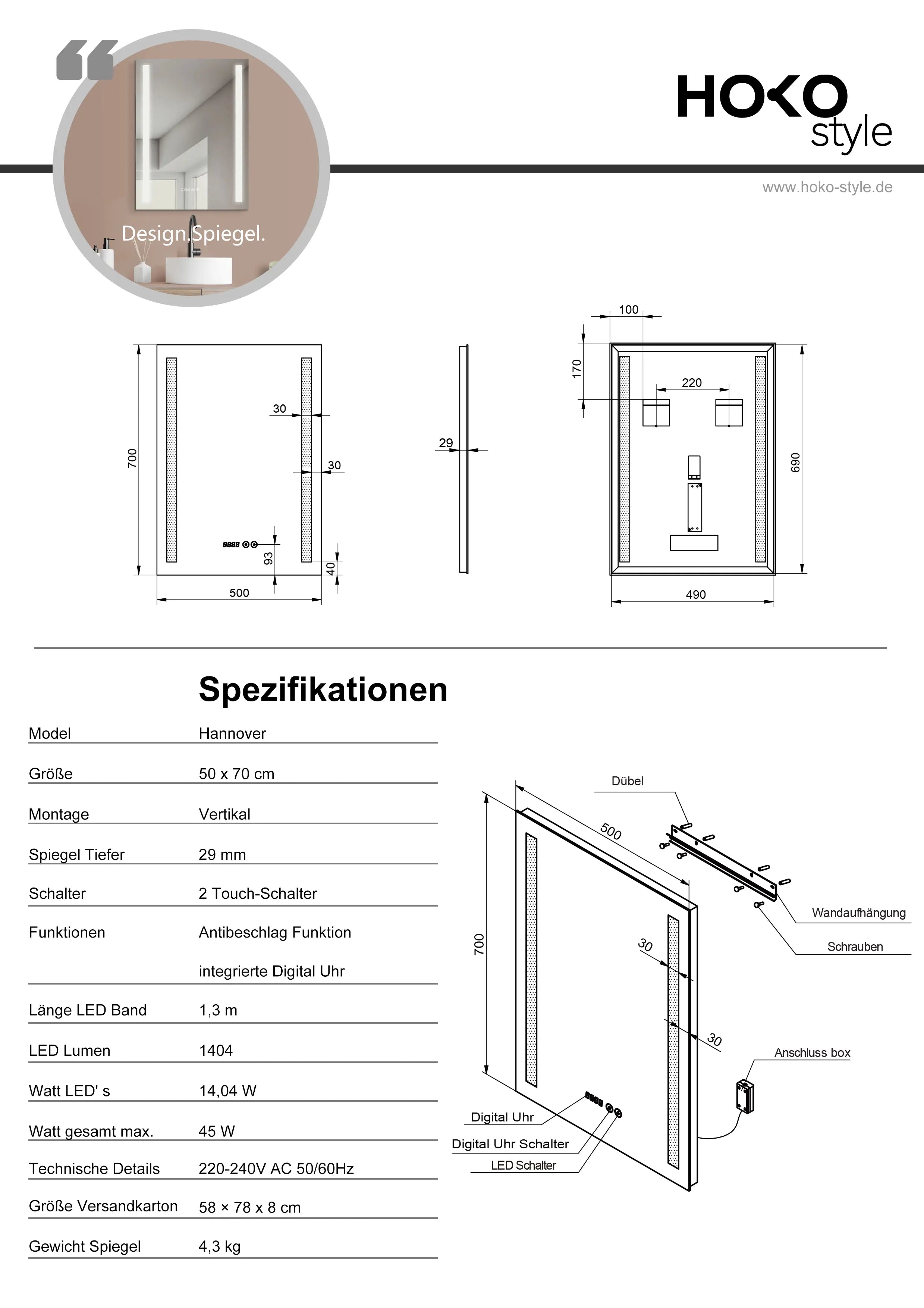 Die Montage der HOKO-Spiegel ist sehr einfach. Das benutzerfreundliche Aufhängesystem mit integrierter Wasserwaage erleichtert den Prozess erheblich. Auch der sichere Stromanschluss ist unkompliziert, sodass eine Person die Installation in ca. 15 Minuten durchführen kann.