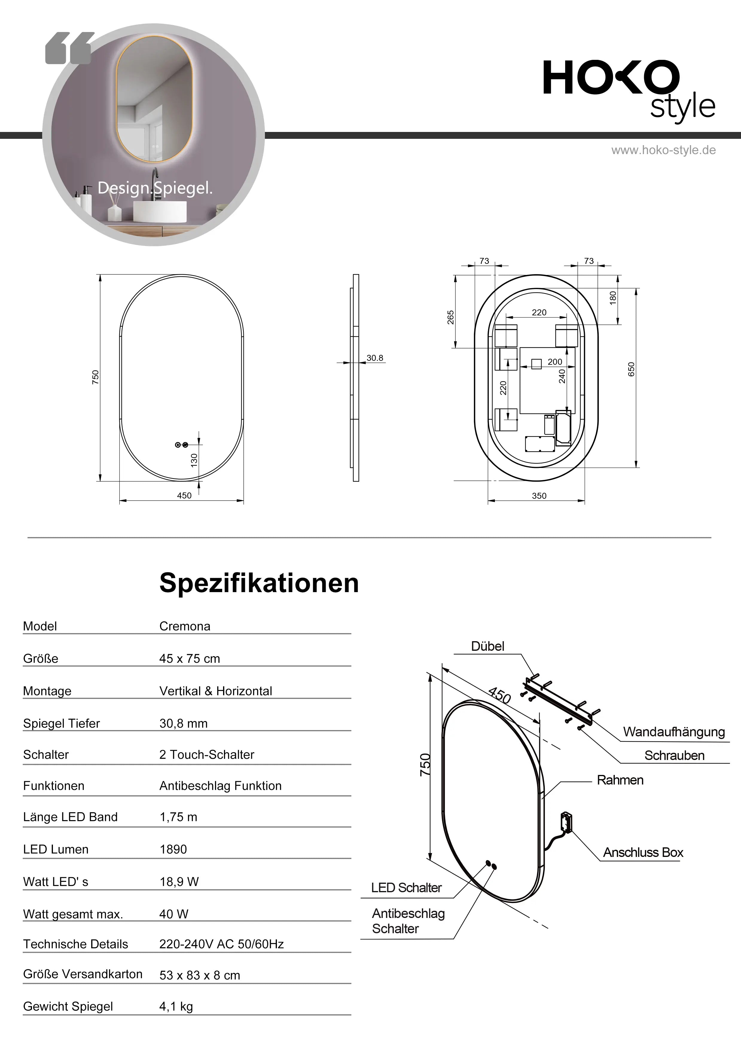 Dieser ovale LED beleuchtete Bad Spiegel verfügt über eine Antibeschlag-Funktion die in die Spiegelfläche integriert ist. Diese verhindert das Beschlagen bei hoher Luftfeuchtigkeit im Badezimmer.