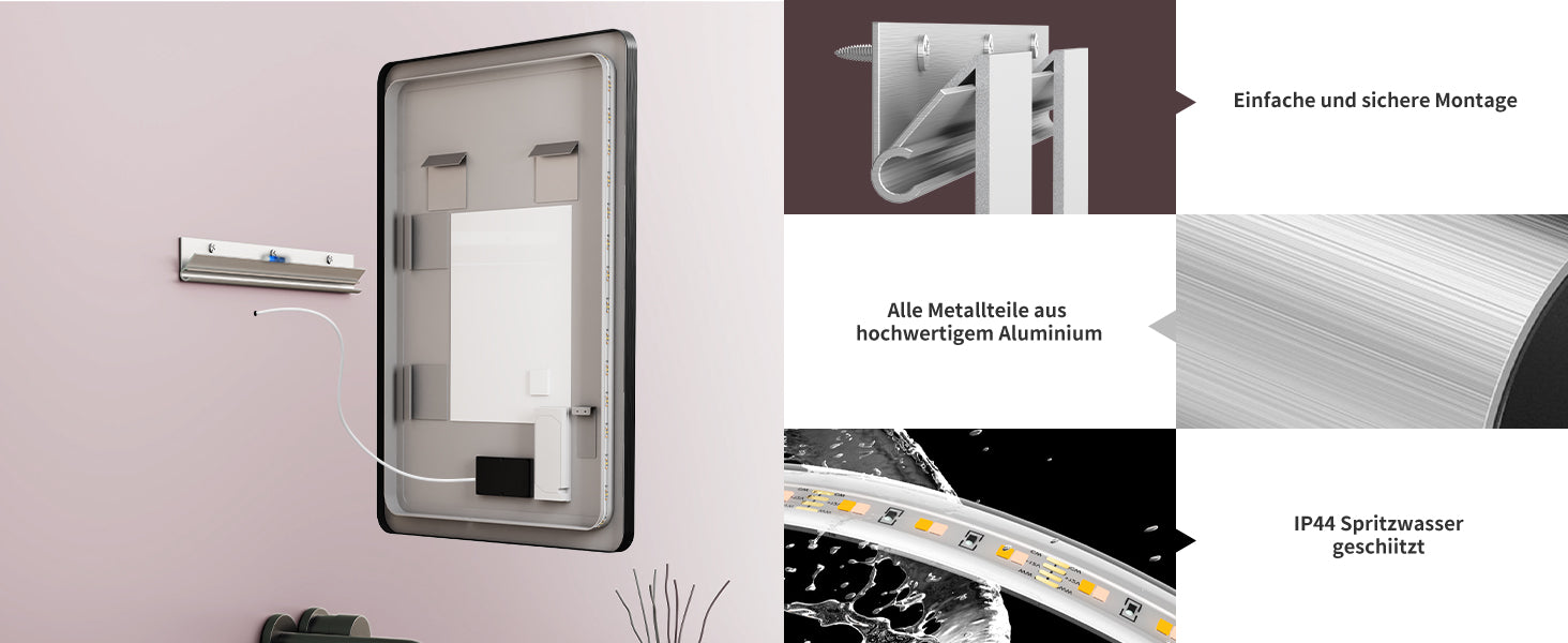 Die Montage der HOKO-Spiegel ist sehr einfach. Das benutzerfreundliche Aufhängesystem mit integrierter Wasserwaage erleichtert den Prozess erheblich. Auch der sichere Stromanschluss ist unkompliziert, sodass eine Person die Installation in ca. 15 Minuten durchführen kann.