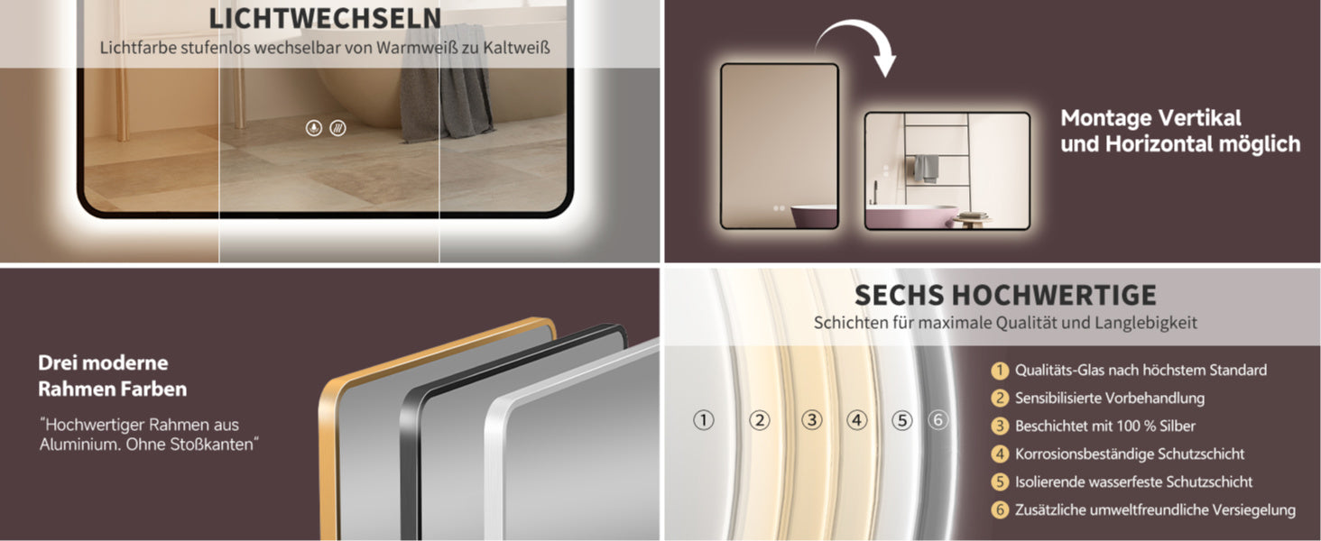 ANTIBESCHLAG LED Wandspiegel mit Schwarz Metall Rahmen, Lichtwechsel