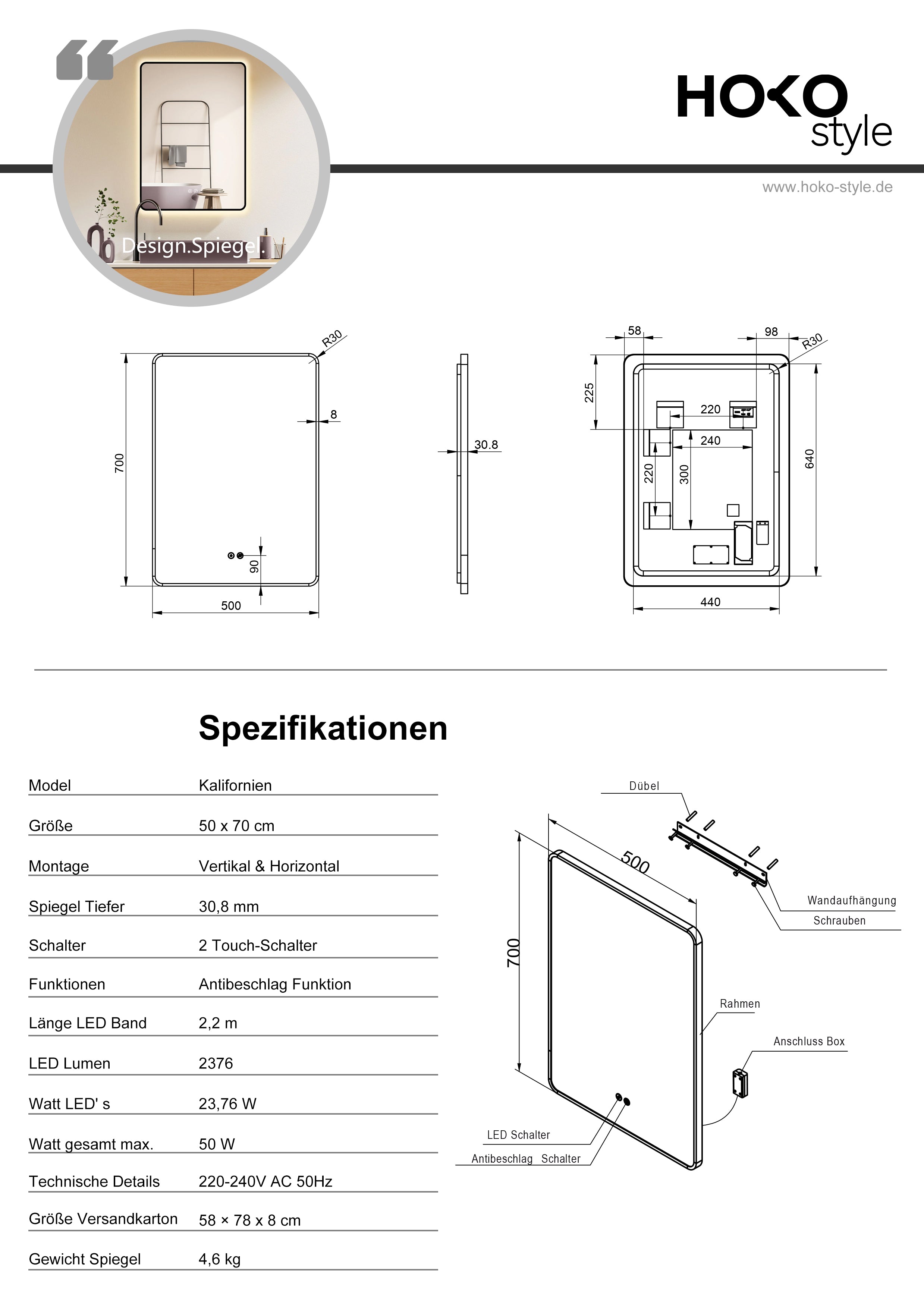 Dieser LED beleuchtete Bad Spiegel verfügt über eine Antibeschlag-Funktion auf der Spiegelfläche. Diese verhindert das Beschlagen bei hoher Luftfeuchtigkeit! Diese kann manuell über den Touch-Schalter deaktiviert werden, eine automatische Abschaltung der Spiegelheizung erfolgt nach 45 Minuten.