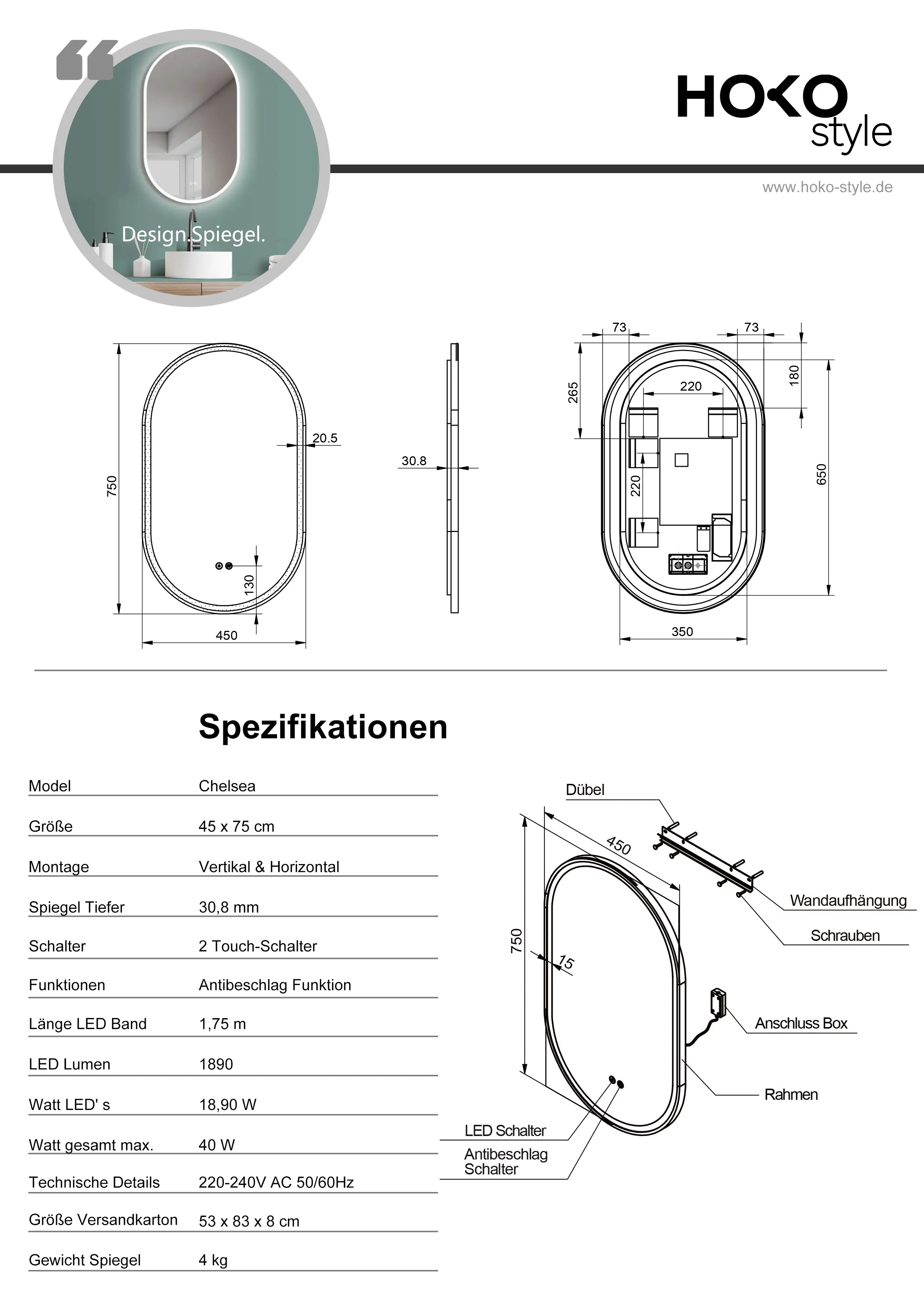 Dieser ovale LED beleuchtete Badezimmerspiegel verfügt über eine Antibeschlag-Funktion die in die Spiegelfläche integriert ist. Diese verhindert das Beschlagen bei hoher Luftfeuchtigkeit im Badezimmer.