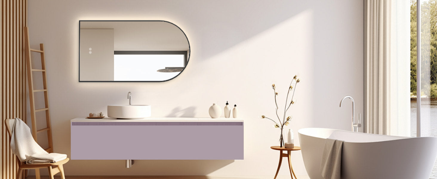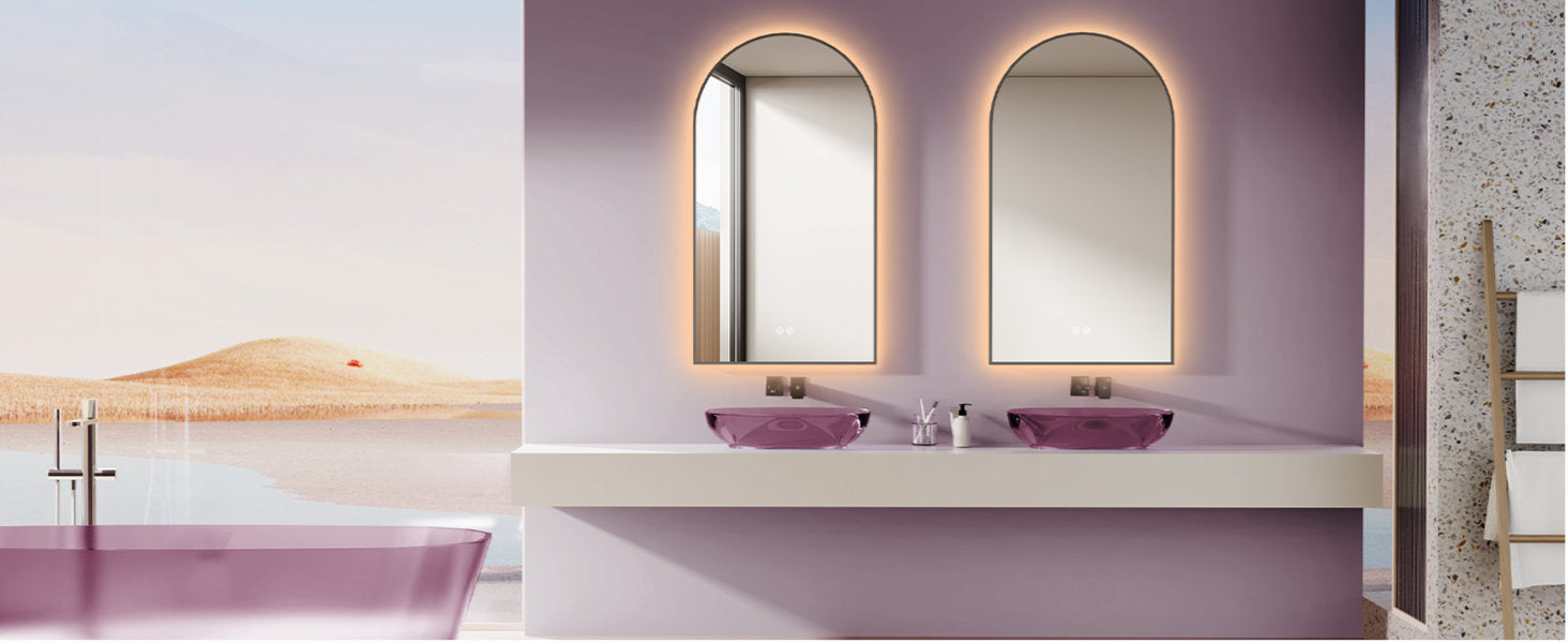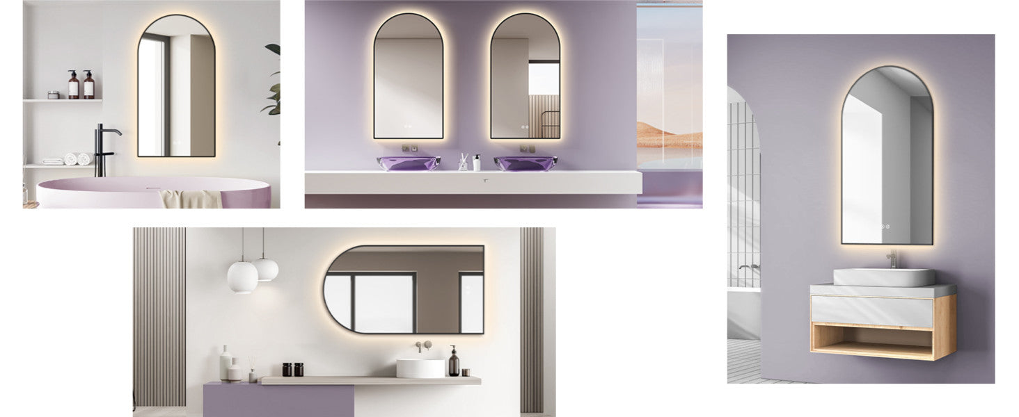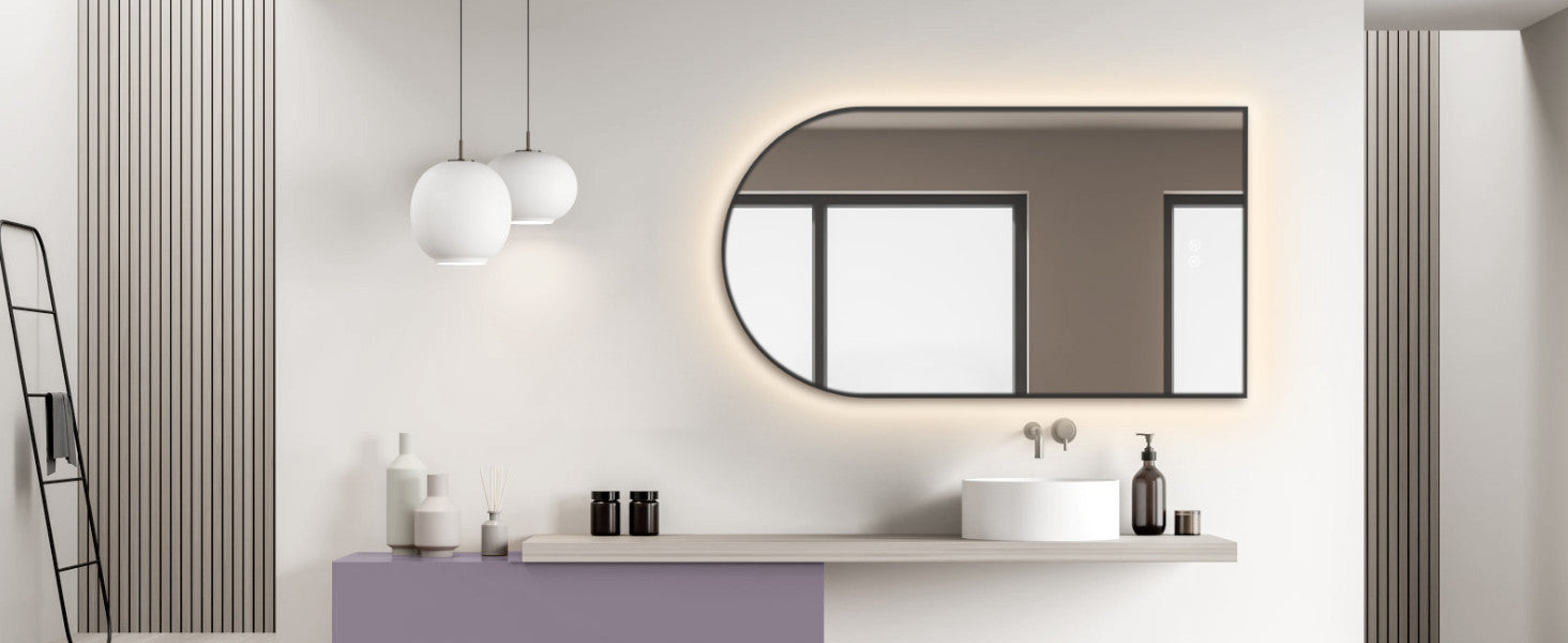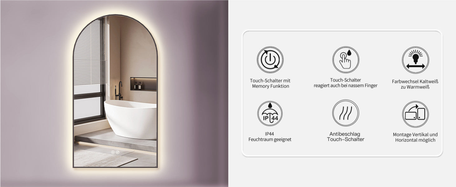 LED Badspiegel mit SPIEGEL HEIZUNG, Bogenform mit Schwarz Metall Rahmen