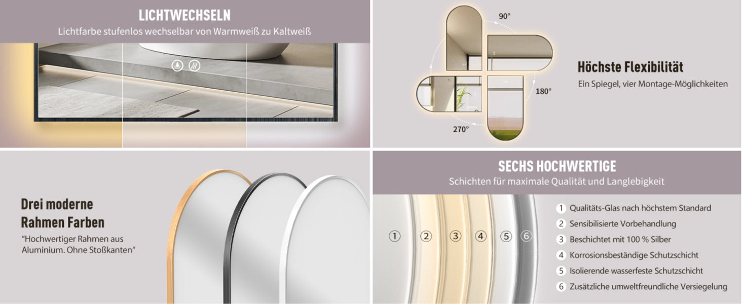 Vielseitige Anwendung. Dieser LED-Badezimmerspiegel mit Metallrahmen kann horizontal oder vertikal aufgehängt werden. Er dient auch als Schminkspiegel, Dekospiegel sowie als Wandspiegel für Schlafzimmer, Wohnzimmer, Flur und mehr.
