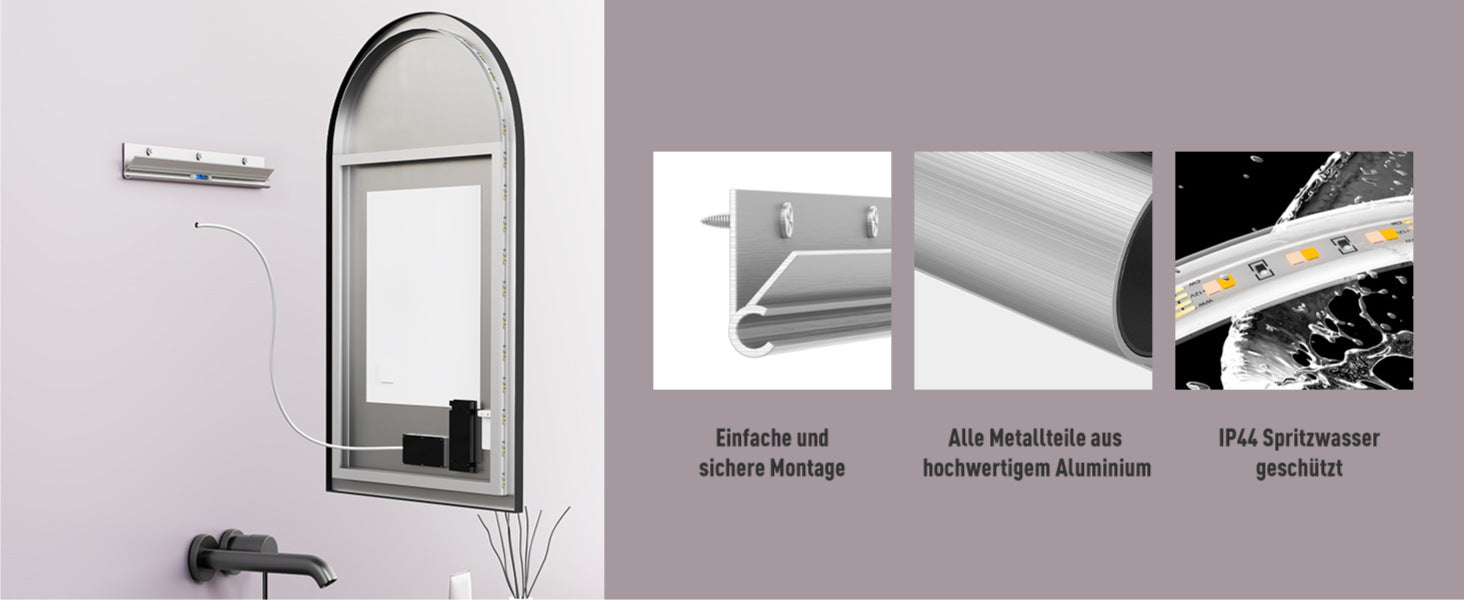 Premium-Verpackung und einfache Montage. Inkl. Montageanleitung und Zubehör zur Montage an Massiv-Wänden. Geeignet für Feuchträume wie Badezimmer (IP44). Geringer Stromverbrauch, SGS-geprüft für Ihre Sicherheit.