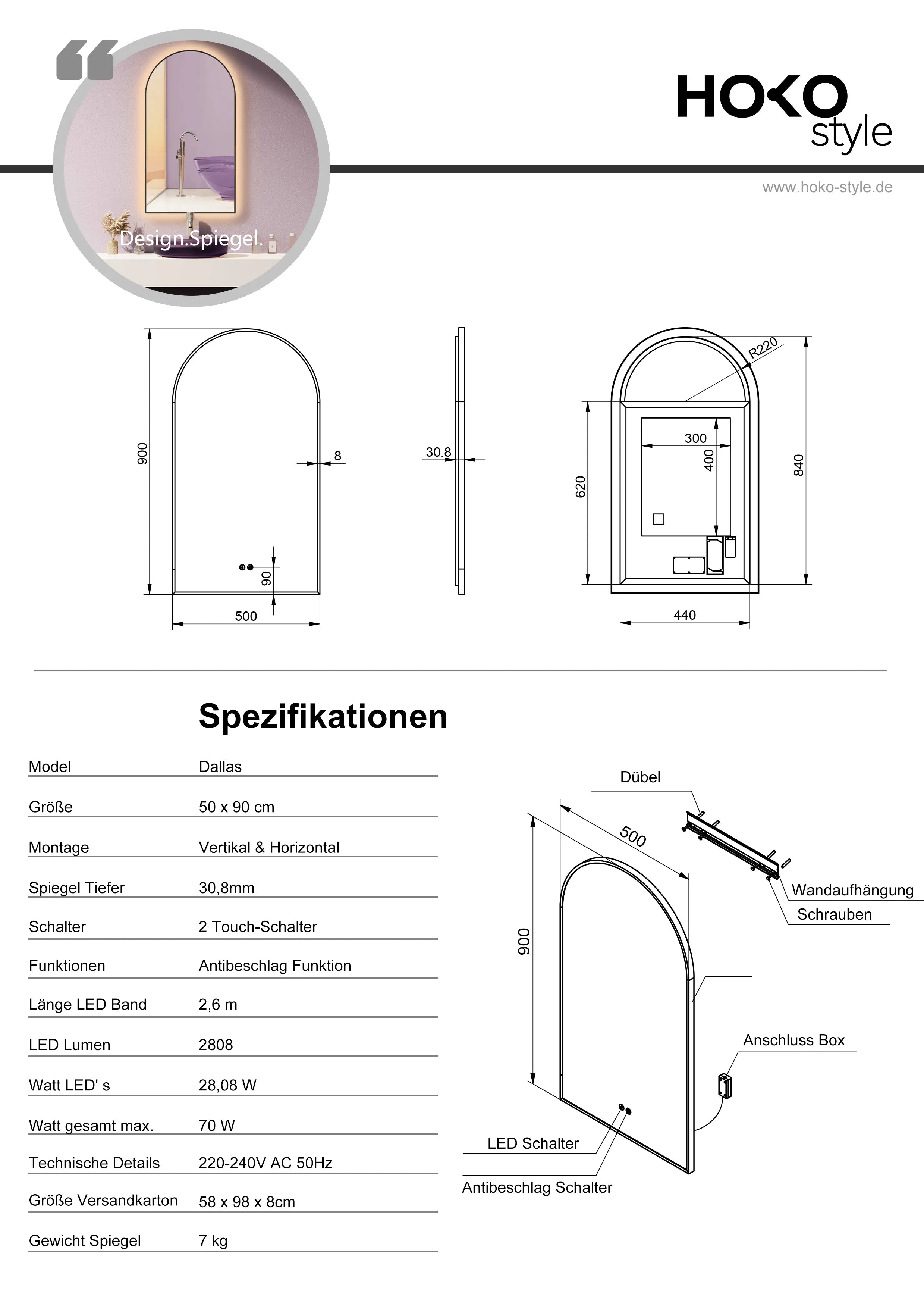Touch-Sensor/Wandschalter-Einrichtung. Der Spiegel wird direkt an das vorhandene Wandkabel angeschlossen und bleibt im installierten Zustand unsichtbar. So lässt sich dieser LED-Lichtspiegel bequem mit dem Lichtschalter aus- und einschalten.