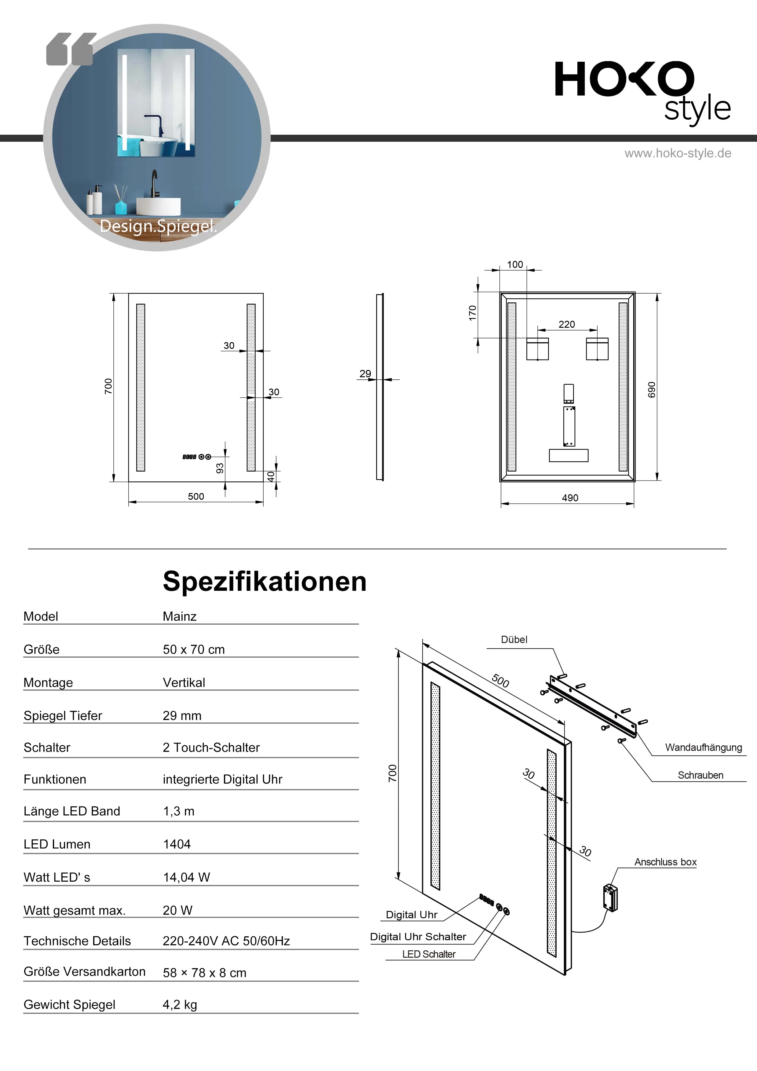 Die Montage der HOKO-Spiegel ist sehr einfach. Das benutzerfreundliche Aufhängesystem mit integrierter Wasserwaage erleichtert den Prozess erheblich. Auch der sichere Stromanschluss ist unkompliziert, sodass eine Person die Installation in ca. 15 Minuten durchführen kann.