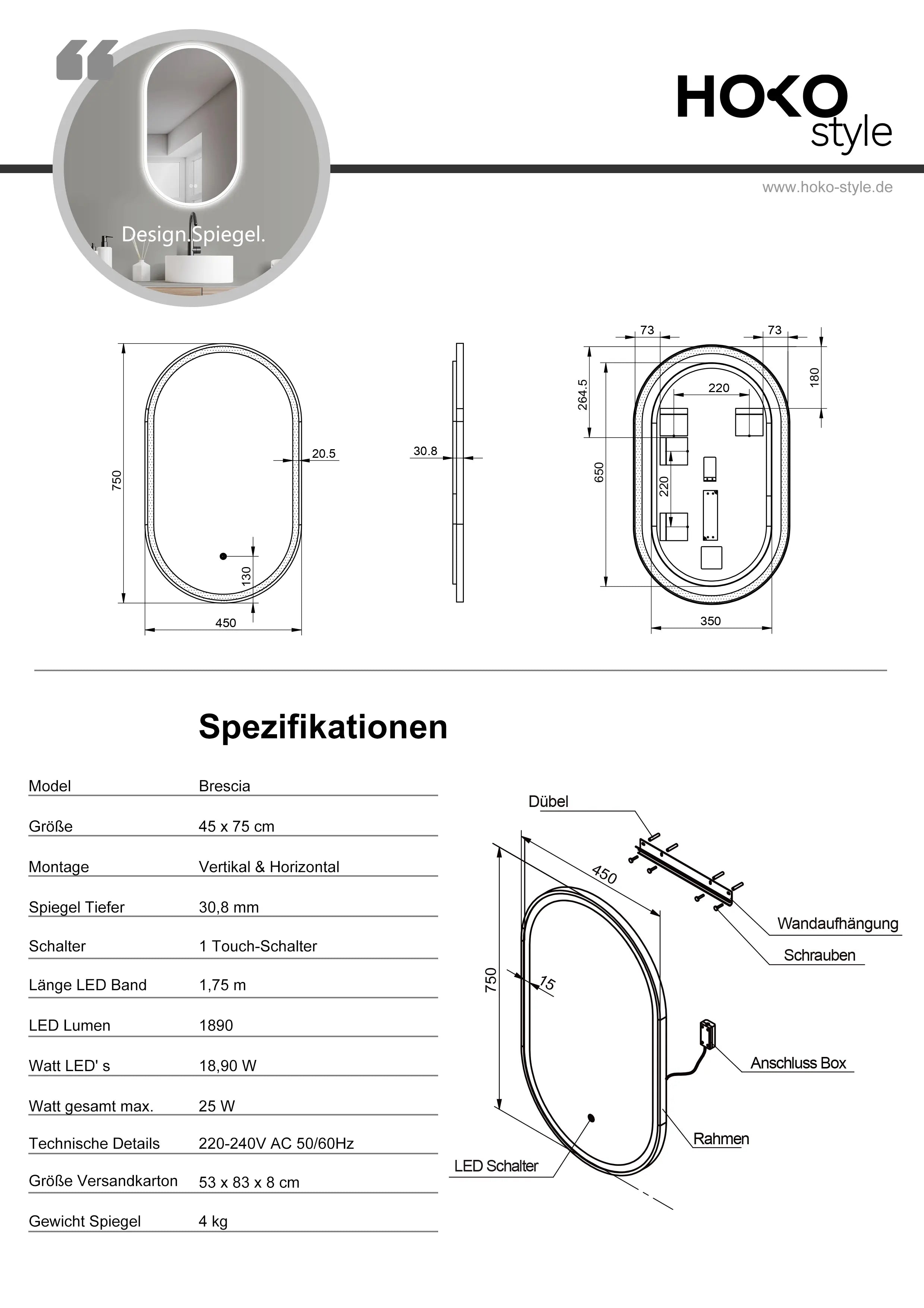 Die Montage der HOKO-Spiegel ist sehr einfach. Das benutzerfreundliche Aufhängesystem mit integrierter Wasserwaage erleichtert den Prozess erheblich. Auch der sichere Stromanschluss ist unkompliziert, sodass eine Person die Installation in ca. 15 Minuten durchführen kann.