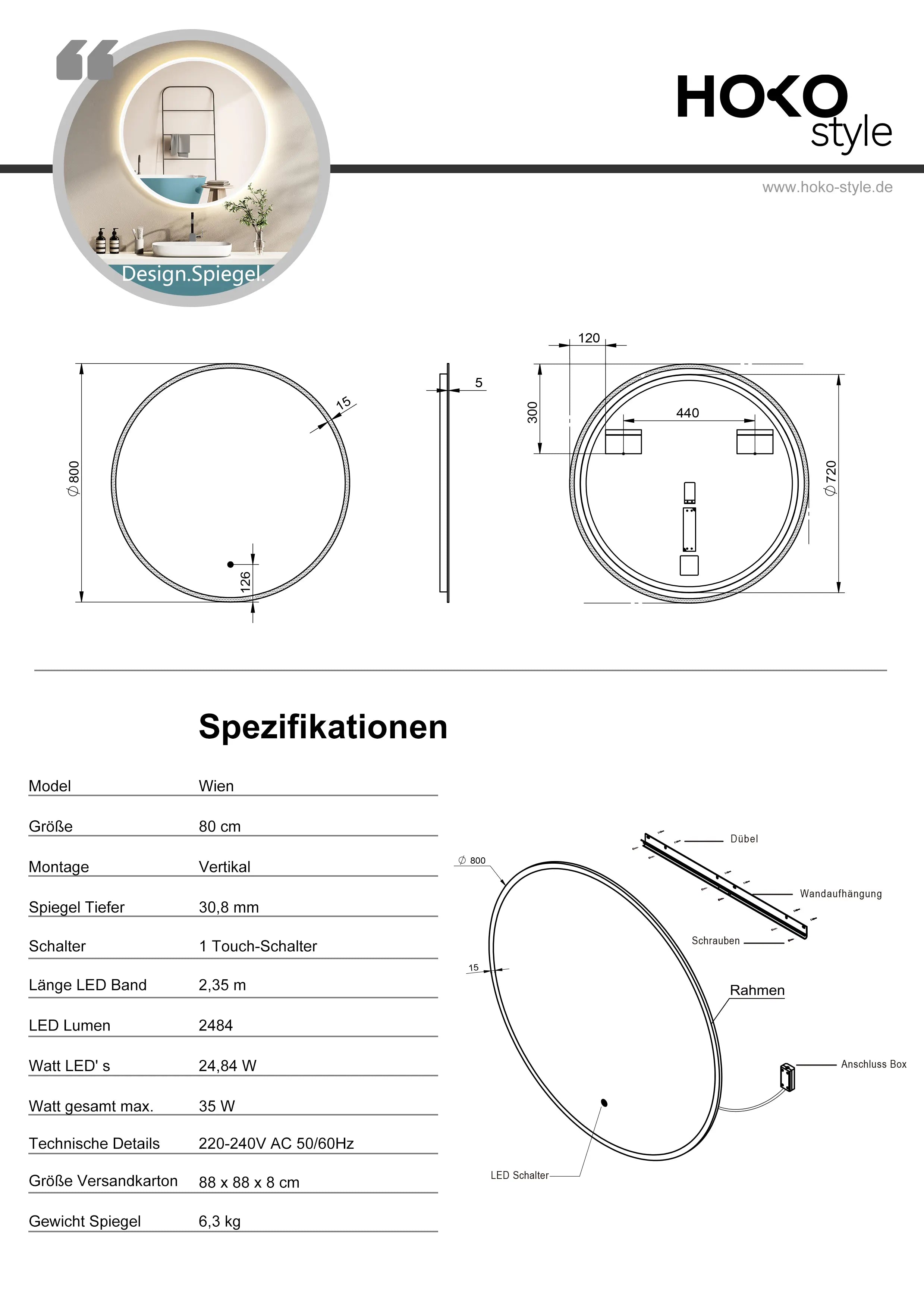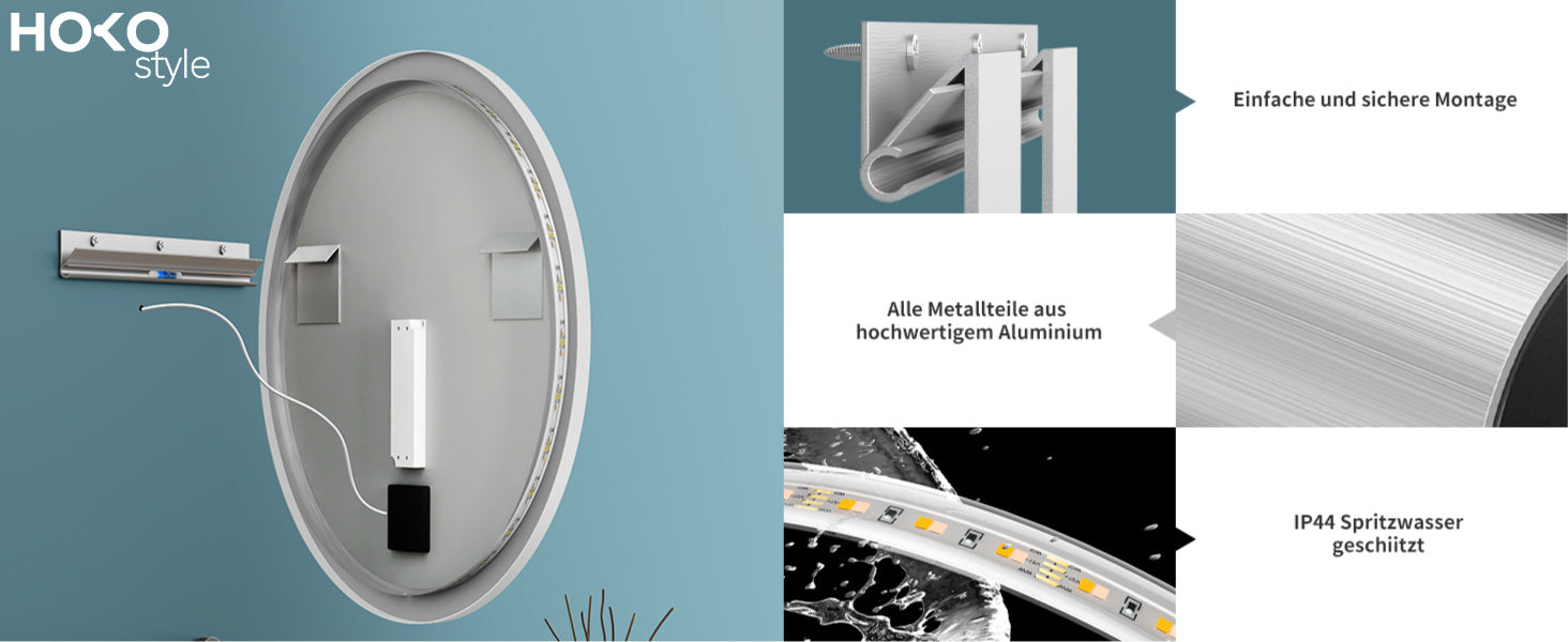 Die Montage der HOKO-Spiegel ist sehr einfach. Das benutzerfreundliche Aufhängesystem mit integrierter Wasserwaage erleichtert den Prozess erheblich. Auch der sichere Stromanschluss ist unkompliziert, sodass eine Person die Installation in ca. 15 Minuten durchführen kann.